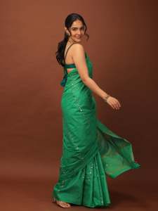 Giccha cotton accentuated with glittering sequins, beads and stars- this Sari is a modern mélange of raw understated glam.